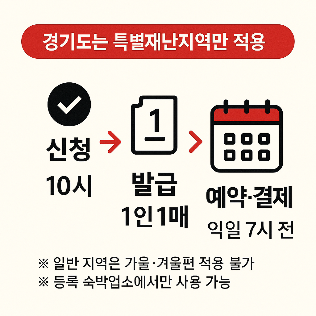 “경기도에서도 숙박세일페스타가 되나요?” — 결론부터 말하면, 경기도 일반 지역은 가을·겨울 기본편 적용 대상이 아닙니다(비수도권 대상). 다만 경기도 내 ‘특별재난지역’으로 지정된 시·군·구에서 숙박할 경우 최대 5만원까지 할인 받을 수 있어요. 아래에서 경기도 이용자 기준으로, 언제·어디서·어떻게 받는지 한 번에 정리했습니다.