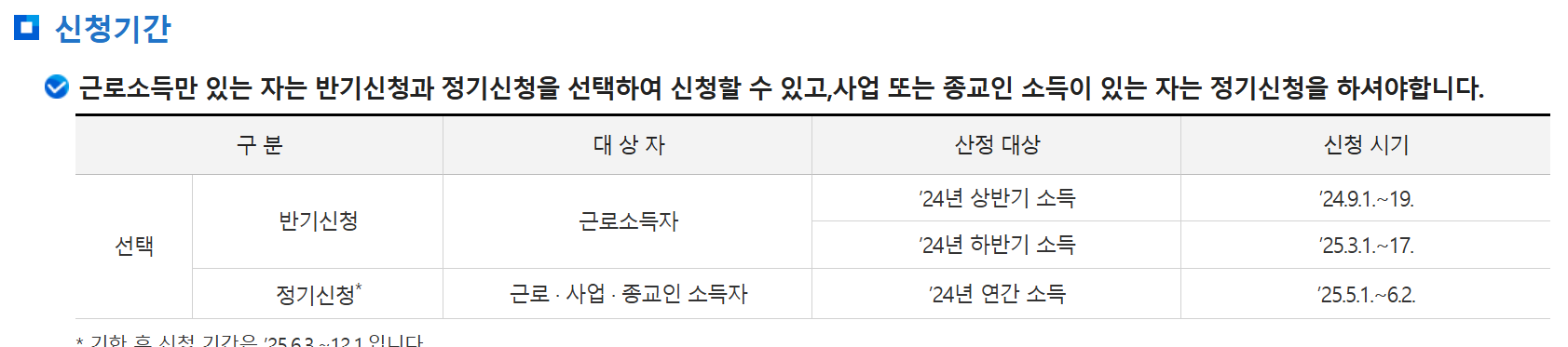 - 근로소득자만 반기신청 가능(사업·종교인 소득 있으면 정기신청 간주)