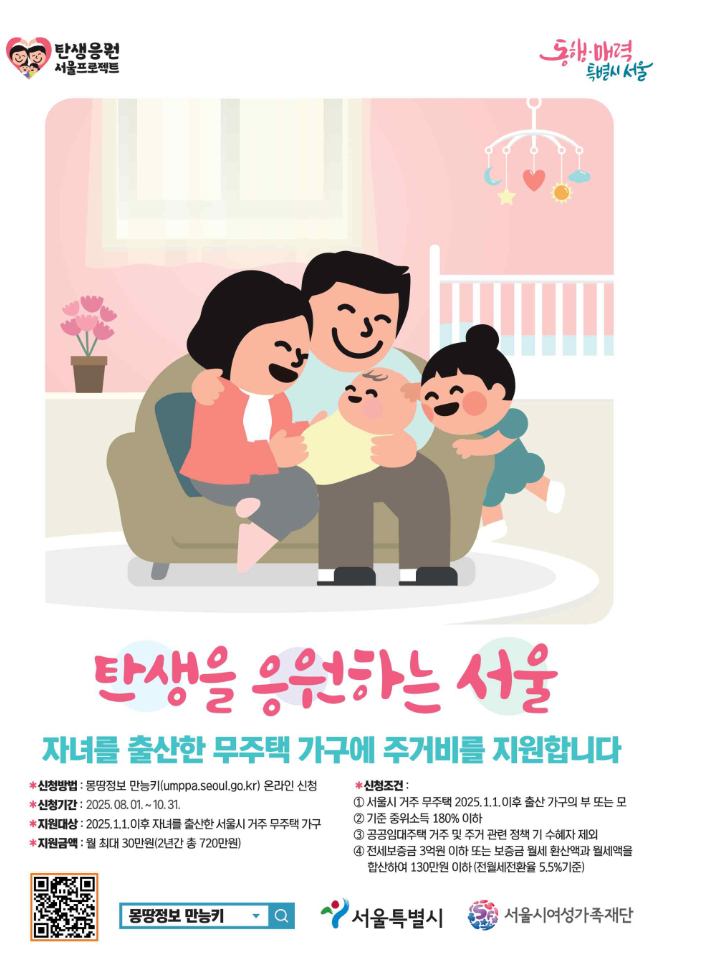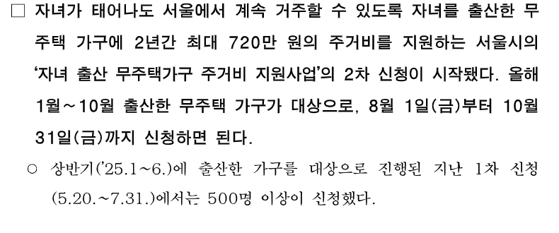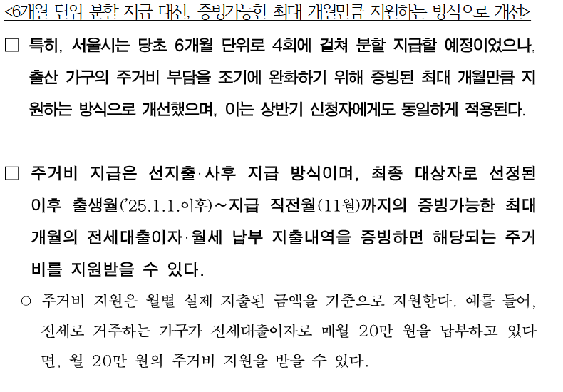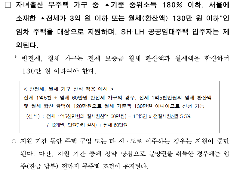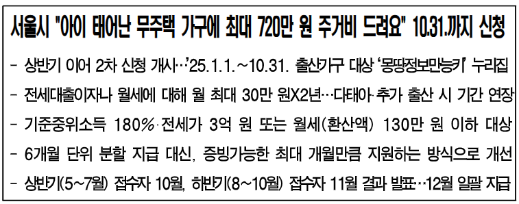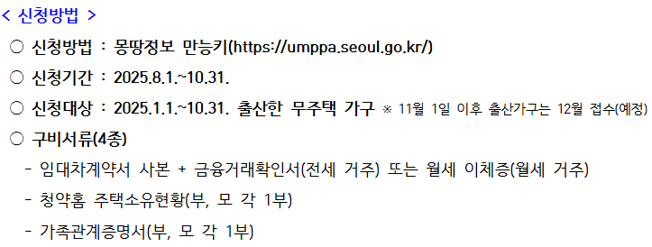 - 대상: 2025.1.1.~10.31. 출산한 서울시 무주택 가구, 기준중위소득 180% 이하, 전세가 3억원 이하 또는 월세(환산액) 130만원 이하