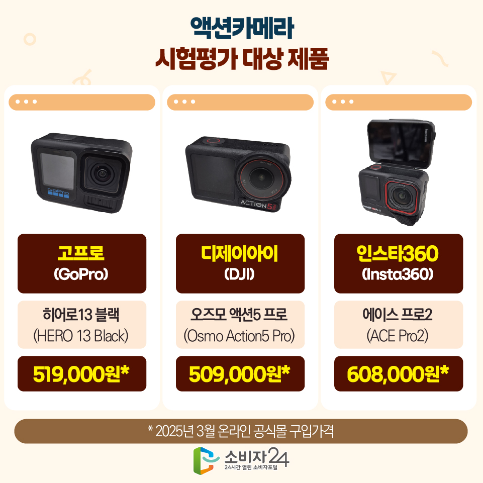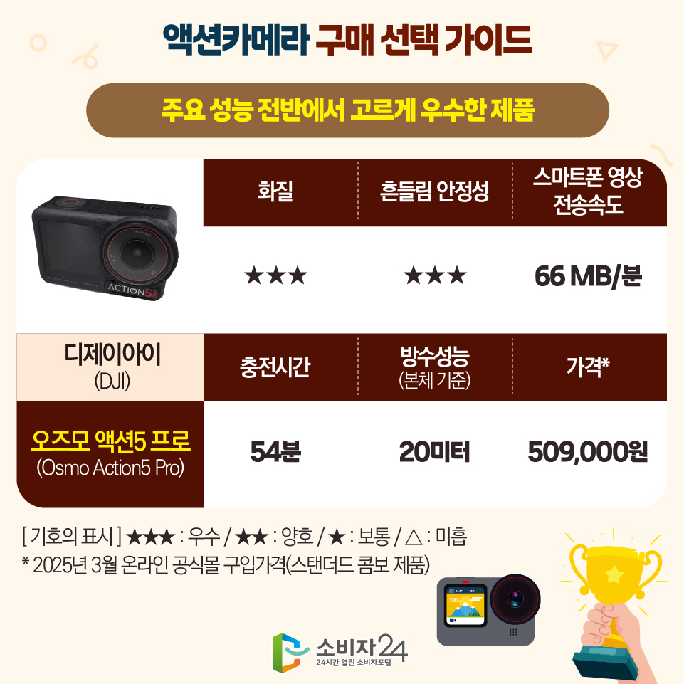 DJI의 오즈모 액션 5 프로가 전반적으로 우수한 성능을 보여 소비자원 추천 제품으로 선정되었습니다.