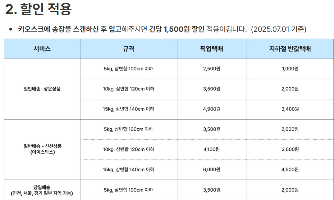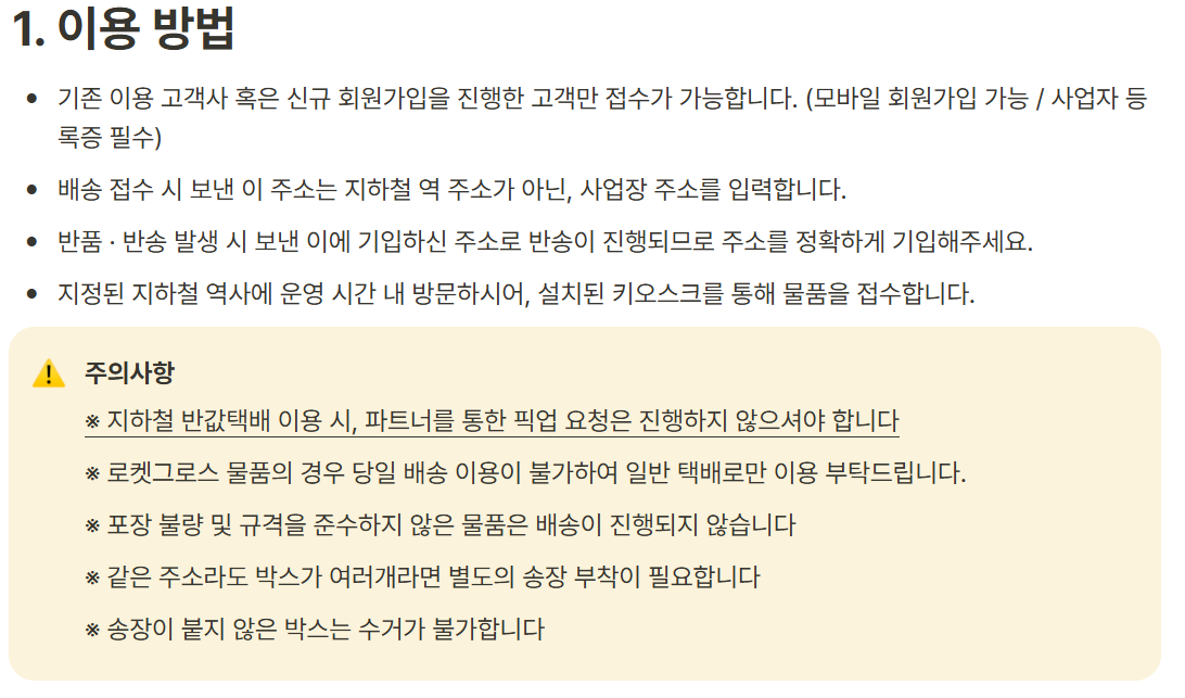 - 주의: 물품가 50만원 초과 품목은 접수 불가, 기사 건물 진입 불가·통화 1회 부재 시 당일 픽업 미진행(재방문 없음).