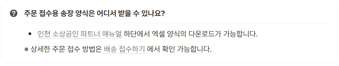 - 현장 운영: 접수·송장·출고·정산·조회 절차는 ‘인천 소상공인 투데이 파트너’ 웹앱에서 처리(설치 無).